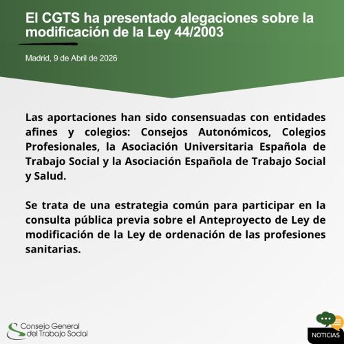 Tras la reunión informativa celebrada ayer con Consejos Autonómicos, Colegios Profesionales, la Asociación Universitaria Española de Trabajo Social y la Asociación Española de Trabajo Social y Salud, el conjunto de la profesión ha acordado impulsar una estrategia de actuación común en el marco del proceso de consulta pública previa sobre el Anteproyecto de Ley de modificación de la Ley 44/2003, de 21 de noviembre, de ordenación de las profesiones sanitarias.