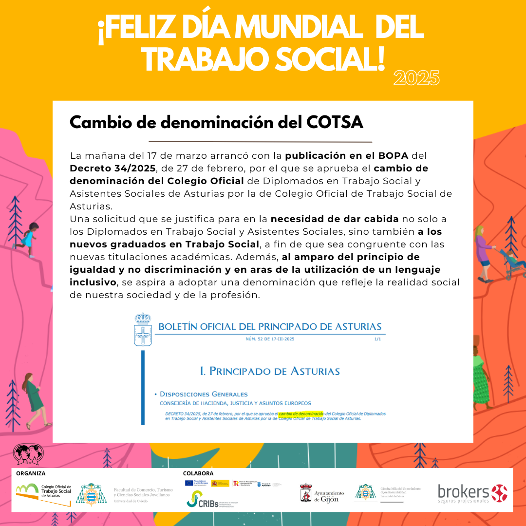 Hoy, queremos compartir contigo los detalles de este día tan especial. Una mañana del 17 de marzo, que arrancó con la publicación en el BOPA del Decreto 34/2025, de 27 de febrero, por el que se aprueba el cambio de denominación del Colegio Oficial de Diplomados en Trabajo Social y Asistentes Sociales de Asturias por la de Colegio Oficial de Trabajo Social de Asturias. Una solicitud que se justifica para en la necesidad de dar cabida no solo a los Diplomados en Trabajo Social y Asistentes Sociales, sino también a los nuevos graduados en Trabajo Social, a fin de que sea congruente con las nuevas titulaciones académicas. Además, al amparo del principio de igualdad y no discriminación y en aras de la utilización de un lenguaje inclusivo, se aspira a adoptar una denominación que refleje la realidad social de nuestra sociedad y de la profesión.