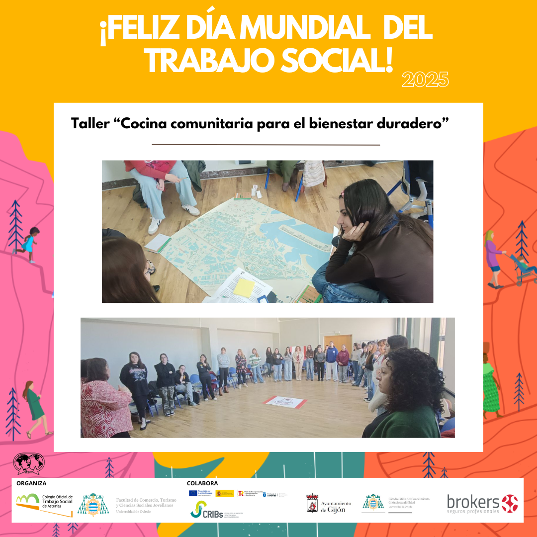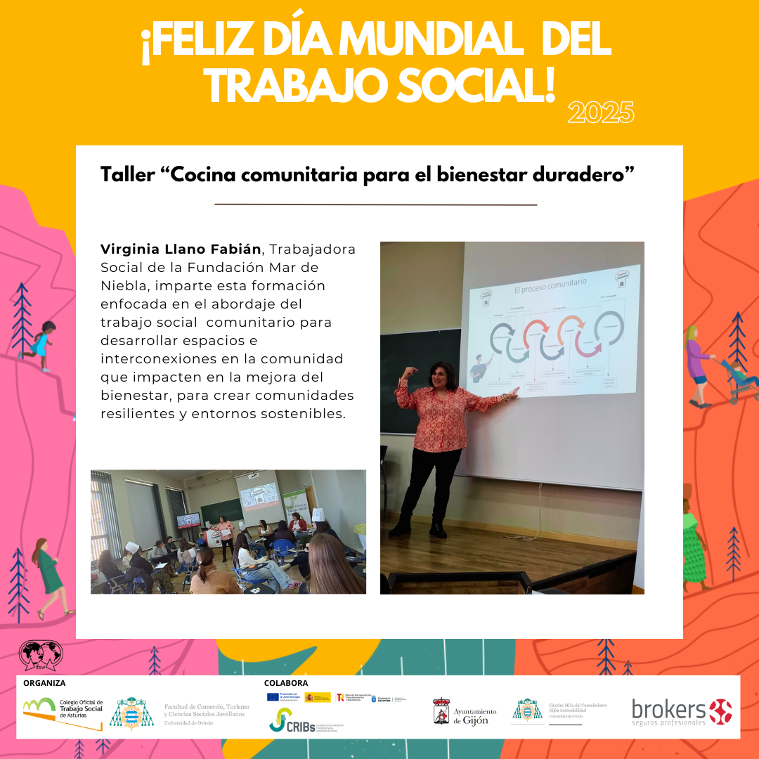 A continuación, ya en La Laboral, Virginia Llano Fabian de Fundación Mar de Niebla, fue la encargada de abrir los actos del Día Mundial con un taller práctico sobre "Impulsando comunidades y entornos sostenibles: conviértete en la Cocina Comunitaria con más estrellas del bienestar duradero". Una experiencia enriquecedora que puso el foco en la importancia del Trabajo Social Comunitario. Puedes descargar aquí la "Guía para la construcción y desarrollo de cocinas comunitarias" que se facilitó entre las participantes.