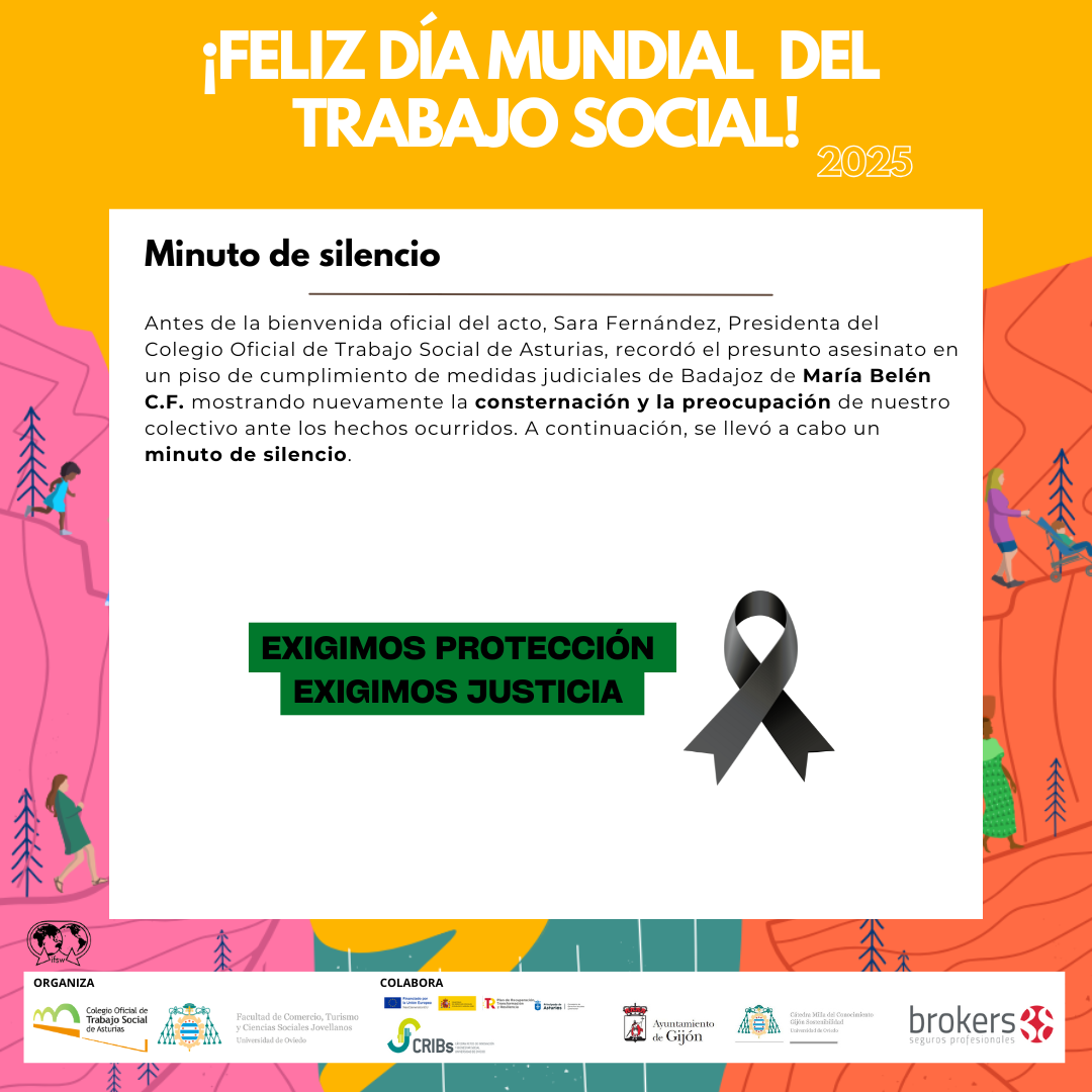 Por la tarde, y antes de la bienvenida oficial del acto, Sara Fernández, Presidenta del Colegio Oficial de Trabajo Social de Asturias, recordó el presunto asesinato en un piso de cumplimiento de medidas judiciales de Badajoz de María Belén C.F. mostrando nuevamente la consternación y la preocupación de nuestro colectivo ante los hechos ocurridos. A continuación, se llevó a cabo un minuto de silencio.