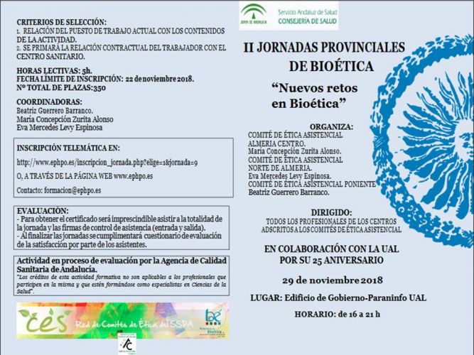Las Jornadas están dirigidas a todos los profesionales de los centros adscritos a los comités de ética asistencial y, tendrán lugar en el Edificio de Gobierno-Paraninfo de la UAL el 29 de noviembre de 16 a 21 horas.