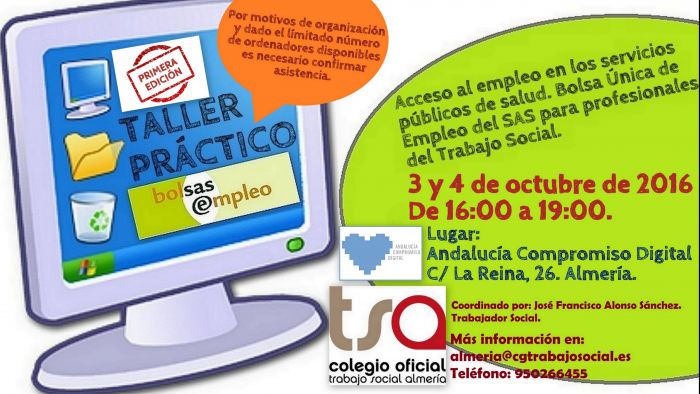 La demanda de empleo entre l@s profesionales del Trabajado Social, es creciente. El acceso al empleo en los Servicios Públicos de Salud y en especial a la Bolsa Única de Empleo del Servicio Andaluz de Salud es poco conocida entre l@s profesionales del Trabajo Social. El Colegio Oficial de Trabajo Social de Almería desea dar respuesta entre sus colegiados y el colectivo de Trabajadores y Trabajadoras Sociales a la incipiente demanda de información sobre el uso de los registros que establecen los servicios públicos de salud en Andalucía y sus empresas públicas afines.