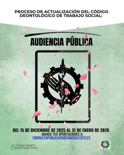De conformidad a lo establecido en el artículo 8 del Real Decreto 472/2021 de 29 de junio por el que se incorpora al ordenamiento jurídico español la Directiva (UE) 2018/958, del Parlamento Europeo y del Consejo, de 28 de junio de 2018, relativa al test de proporcionalidad antes de adoptar nuevas regulaciones de profesiones, se da audiencia e información pública sobre EL ANTEPROYECTO DEL CÓDIGO DEONTOLÓGICO DE TRABAJO SOCIAL.