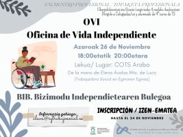 El 26 de noviembre Elena Ávalos, trabajadora social en Eginaren Eginez estará con nosotras para contarnos todo lo relacionado con la recién abierta OVI; Oficina de Vida Independiente.