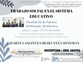 El próximo 26 de febrero se llevará a cabo el primer encuentro profesional de 2025 de la mano de Kris Jausoro y Karmen Uranga, ambas, trabajadoras sociales del Sistema Educativo Vasco.