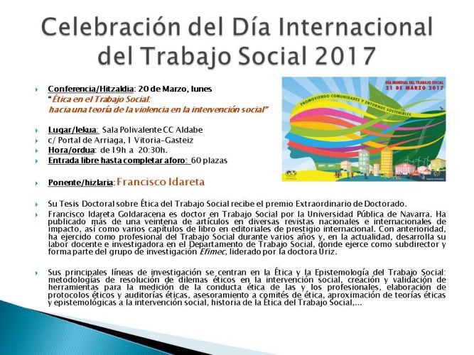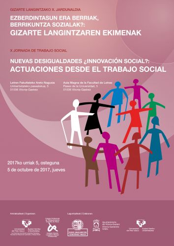 Celebraremos la X edición de la Jornada Anual que organizamos conjuntamente la Facultad de RRLL y Trabajo Social de la UPV/EHU y el Colegio Oficial de Trabajo Social de Alava, el 5 de Octubre 2017, jueves, en el Aula Magna de la Facultad de Letras de la UPV/EHU en Vitoria-Gasteiz