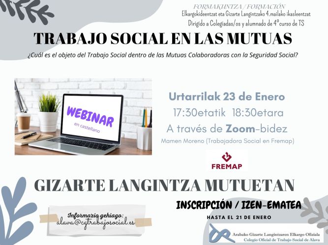 Como personas colegiadas en Araba, todas las profesionales que ejercéis como Trabajadoras Sociales estáis cubiertas por el Seguro de Responsabilidad Civil de Brokers 88. Siendo un servicio nuevo, se ha organizado una Webinar dónde se abordarán temas relacionados con el seguro de responsabilidad civil profesional, proporcionando información esencial para la comprensión y el conocimiento de este. Si tienes alguna pregunta específica sobre el seguro de responsabilidad civil profesional o necesitas más información al respecto, esta es tu webinar!!!!