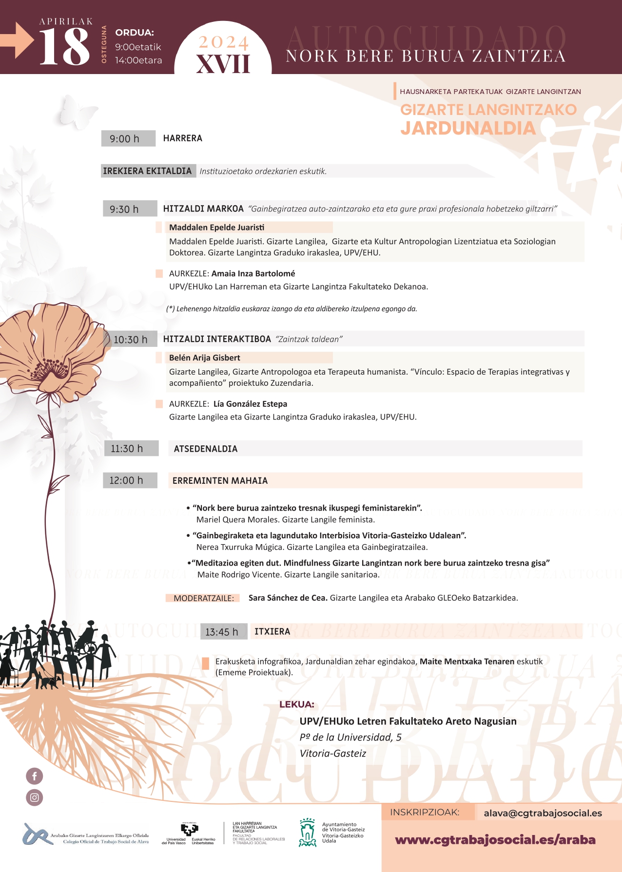Lan Harreman eta Gizarte Langintza Fakultatearekin batera, Gasteizko Udalaren laguntzarekin, urteko moduan antolatzen dugun Gizarte Langintzako XVII. Jardunaldiaren programa bidaltzen dizuegu.