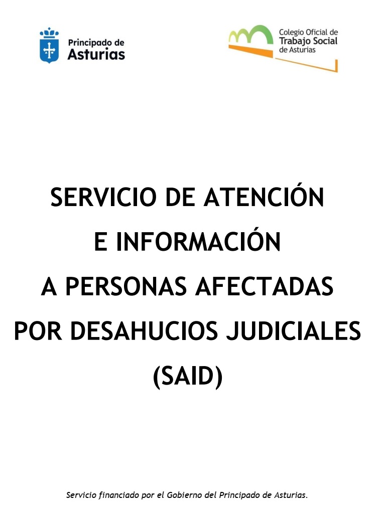 El Servicio de Atención e Información a personas afectadas por Desahucios judiciales de Asturias (SAID), financiado por el gobierno del Principado de Asturias, se desarolla en las sedes judiciales de Gijón, Oviedo y Avilés, por tres trabajadoras sociales colegiadas.