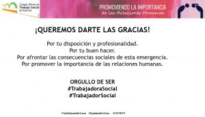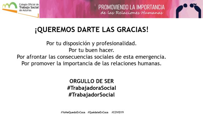 Inmersas en esta emergencia sanitaria, económica y social en la que nos encontramos, desde el Colegio Oficial de Trabajo Social de Asturias no queremos dejar pasar esta oportunidad para dar las gracias a todas y todos por este esfuerzo colectivo que estamos haciendo.
