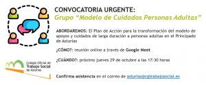Te convocamos de manera urgente a una reunión online a través de Google Meet para el próximo jueves 29 de octubre a las 17:30 horas para trabajar sobre el Plan de Acción para la transformación del modelo de apoyos y cuidados de larga duración a personas adultas en el Principado de Asturias.