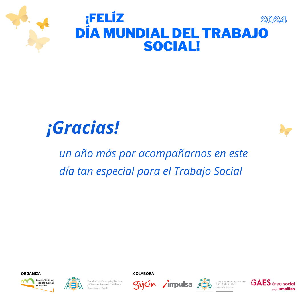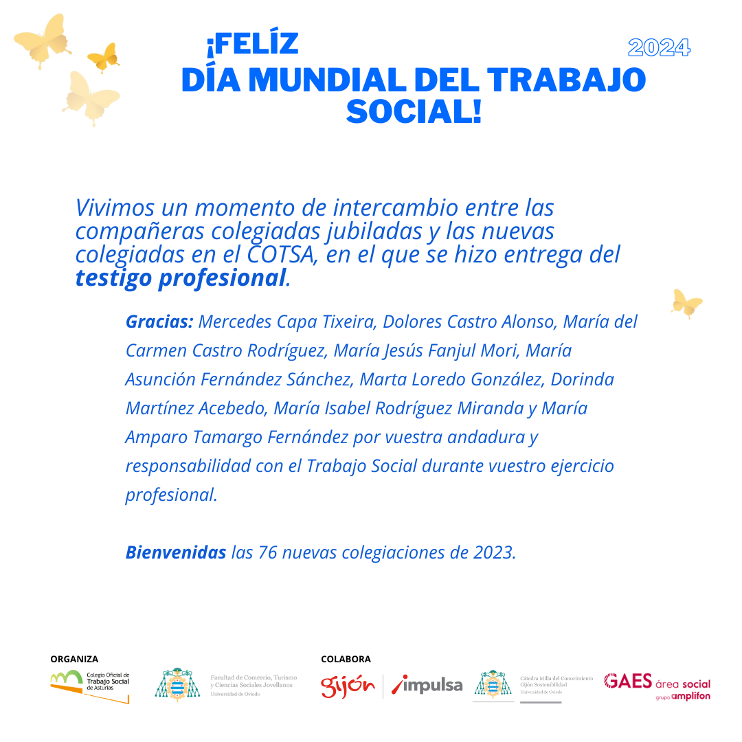 Homenajeamos a las compañeras que se han jubilado en el último año. Gracias Mercedes Capa Tixeira, Dolores Castro Alonso, María del Carmen Castro Rodríguez, María Jesús Fanjul Mori, María Asunción Fernández Sánchez, Marta Loredo González, Dorinda Martínez Acebedo, María Isabel Rodríguez Miranda y María Amparo Tamargo Fernández por vuestra andadura y responsabilidad con el Trabajo Social durante vuestro ejercicio profesional.