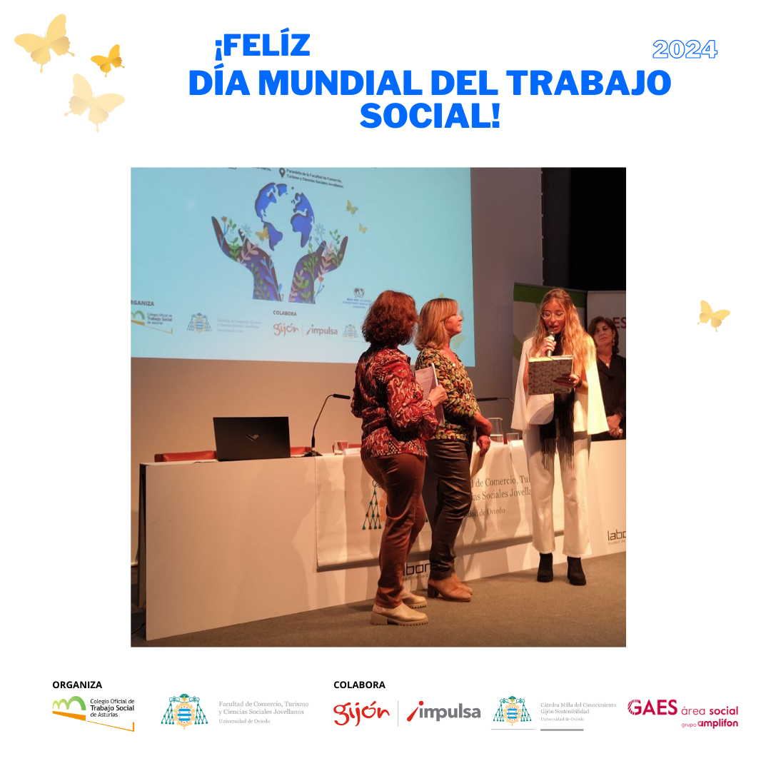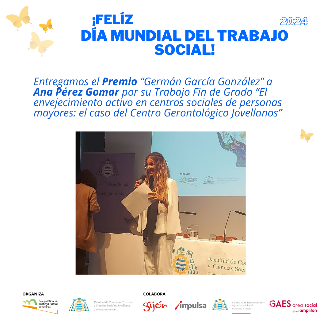 Ana Pérez Gomar recibió el Premio “Germán García González” en su octava edición, por su Trabajo Fin de Grado “El envejecimiento activo en centros sociales de personas mayores: el caso del Centro Gerontológico Jovellanos”. Un trabajo que da voz a las personas participantes en su propio proceso de mejora de su calidad de vida y desarrolla una propuesta concreta de intervención desde nuestra profesión.