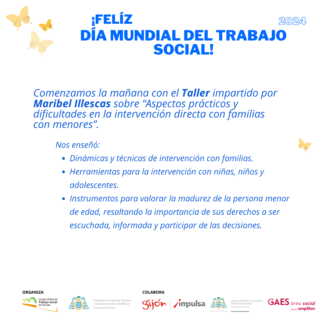 Comenzamos la mañana con un taller sobre “Aspectos prácticos y dificultades en la intervención directa con familias y menores”. Pudimos disfrutar del gran saber de Maribel Illescas, Trabajadora Social con 32 años de experiencia en el Trabajo con familias e infancia.