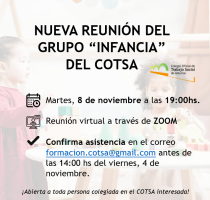 El grupo está abierto a cualquier persona colegiada en el COTSA interesada en la temática. Lo único que necesitamos es que confirmes tu asistencia antes de las 14.00 horas del viernes 4 de noviembre al correo formacion.cotsa@gmail.com para facilitarte el enlace a la reunión.