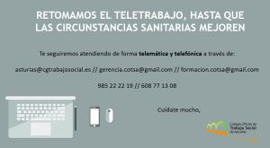 Nos gustaría informarte de que, dados los últimos anuncios realizados desde el Gobierno del Principado de Asturias y las autoridades sanitarias, el personal del COTSA vuelve al teletrabajo hasta que las circunstancias sanitarias mejoren.