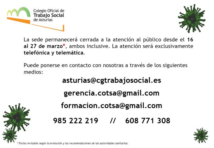 Dadas las circunstancias sanitarias, la sede del Colegio Oficial de Trabajo Social de Asturias permanecerá cerrada a la atención al público desde el 16 al 27 de marzo, ambos inclusive. Estas fechas podrán ser revisadas en función de la evolución y las recomendaciones de las autoridades sanitarias.