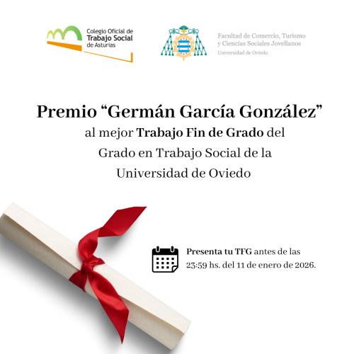 Desde el Colegio Oficial de Trabajo Social de Asturias, en colaboración con la Facultad de Comercio, Turismo y Ciencias Sociales Jovellanos, te invitamos a participar en la X Convocatoria del Premio “Germán García González” al mejor Trabajo Fin de Grado en Trabajo Social de la Universidad de Oviedo.