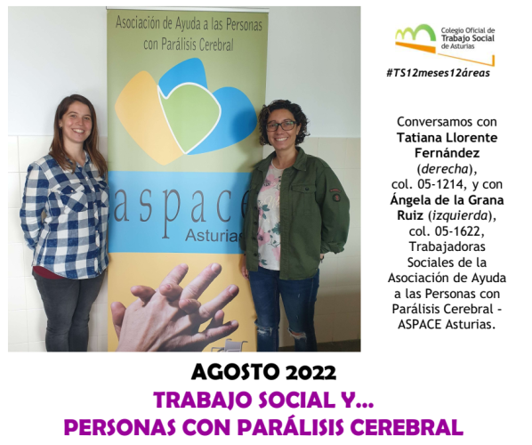 En agosto, conversamos con Tatiana Llorente Fernández (derecha), col. 05-1214, y con Ángela de la Grana Ruiz (izquierda), Trabajadoras Sociales de la Asociación de Ayuda a las Personas con Parálisis Cerebral – ASPACE Asturias.