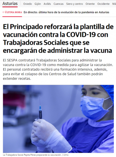 El SESPA contratará Trabajadoras sociales para administrar la vacuna contra la Covid-19 como medida para agilizar la vacunación. El personal contratado recibirá una formación intensiva en aplicación de vacunas que les capacitará para ser parte activa del proceso, asimismo, para evitar el colapso de los centros de salud también podrán extender recetas.