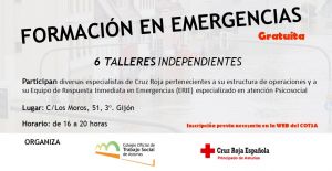 Esta formación se compone de 6 talleres independientes que impartirán en la sede del COTSA (C/Los Moros, 51, 3º – Gijón) diversas especialistas de Cruz Roja pertenecientes a su estructura de operaciones y a su Equipo de Respuesta Inmediata en Emergencias (ERIE) especializado en atención Psicosocial. Los talleres programados son los siguientes: