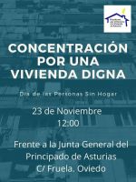 La Plataforma por el Derecho a la Vivienda en Asturias, de la que el COTSA forma parte, quiere convocarte mañana, 23 de noviembre, a una concentración a las 12:00 horas frente a la Junta General del Principado de Asturias (C/ Fruela 13, Oviedo) con motivo del Día de las Personas Sin Hogar.