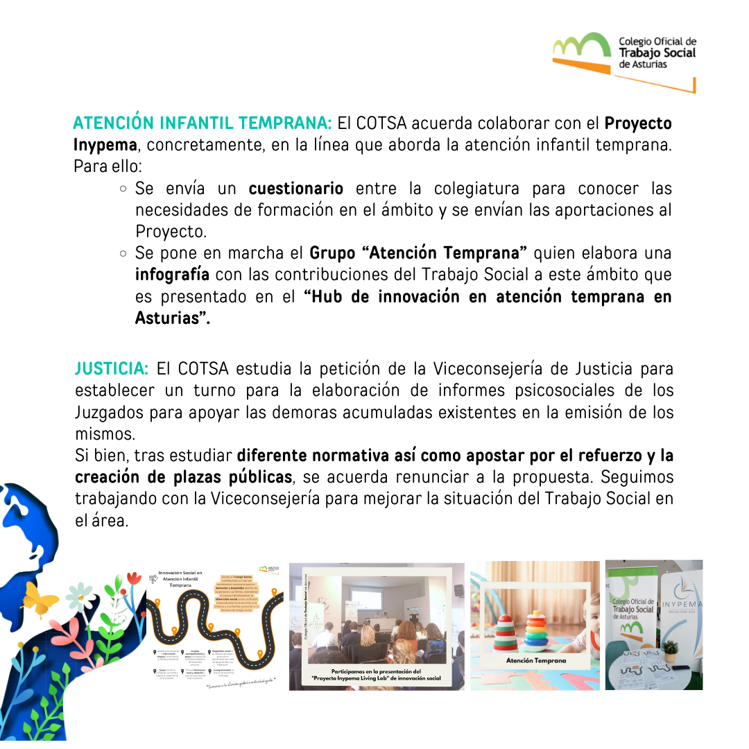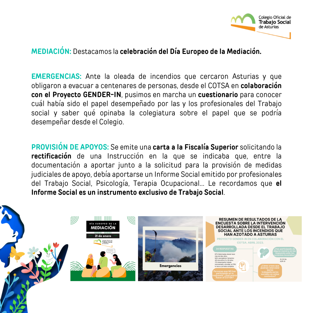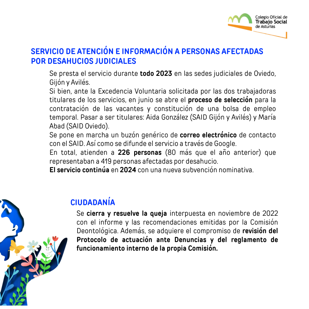 - Todas las acciones llevadas a cabo en torno a los* ejes de defensa profesional*: Servicios Sociales, Dependencia, Salud, Mediación, Emergencias, Provisión de Apoyos, Infancia – Educación, Vivienda, Igualdad, Atención Infantil Temprana, Justicia y Políticas Sociales y de Bienestar.