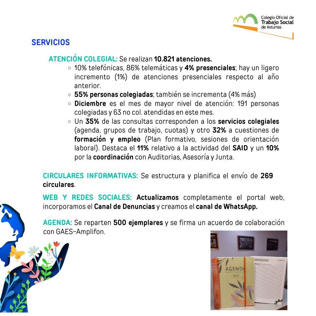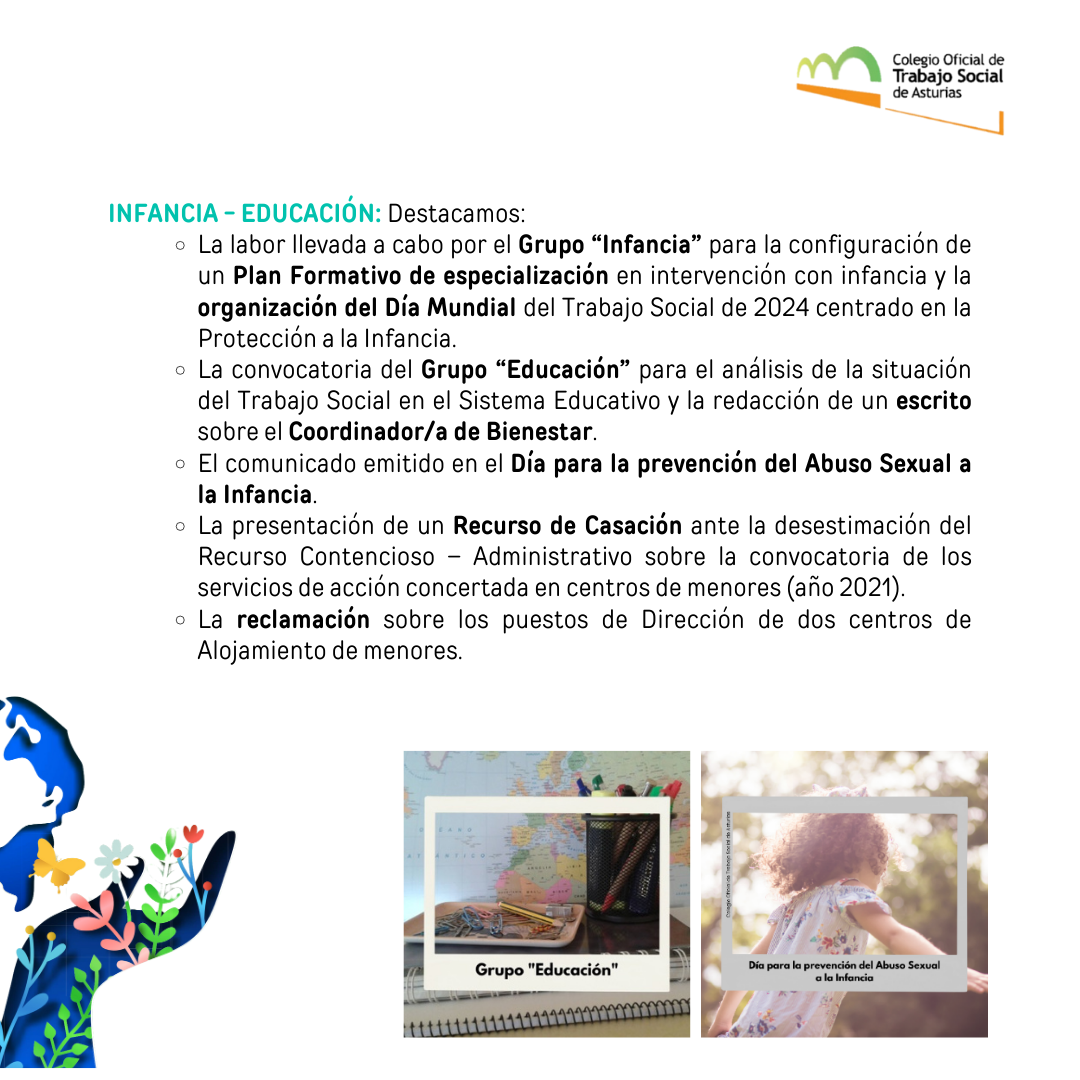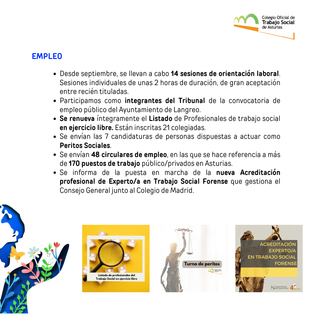 - Todas las acciones llevadas a cabo en torno a los* ejes de defensa profesional*: Servicios Sociales, Dependencia, Salud, Mediación, Emergencias, Provisión de Apoyos, Infancia – Educación, Vivienda, Igualdad, Atención Infantil Temprana, Justicia y Políticas Sociales y de Bienestar.