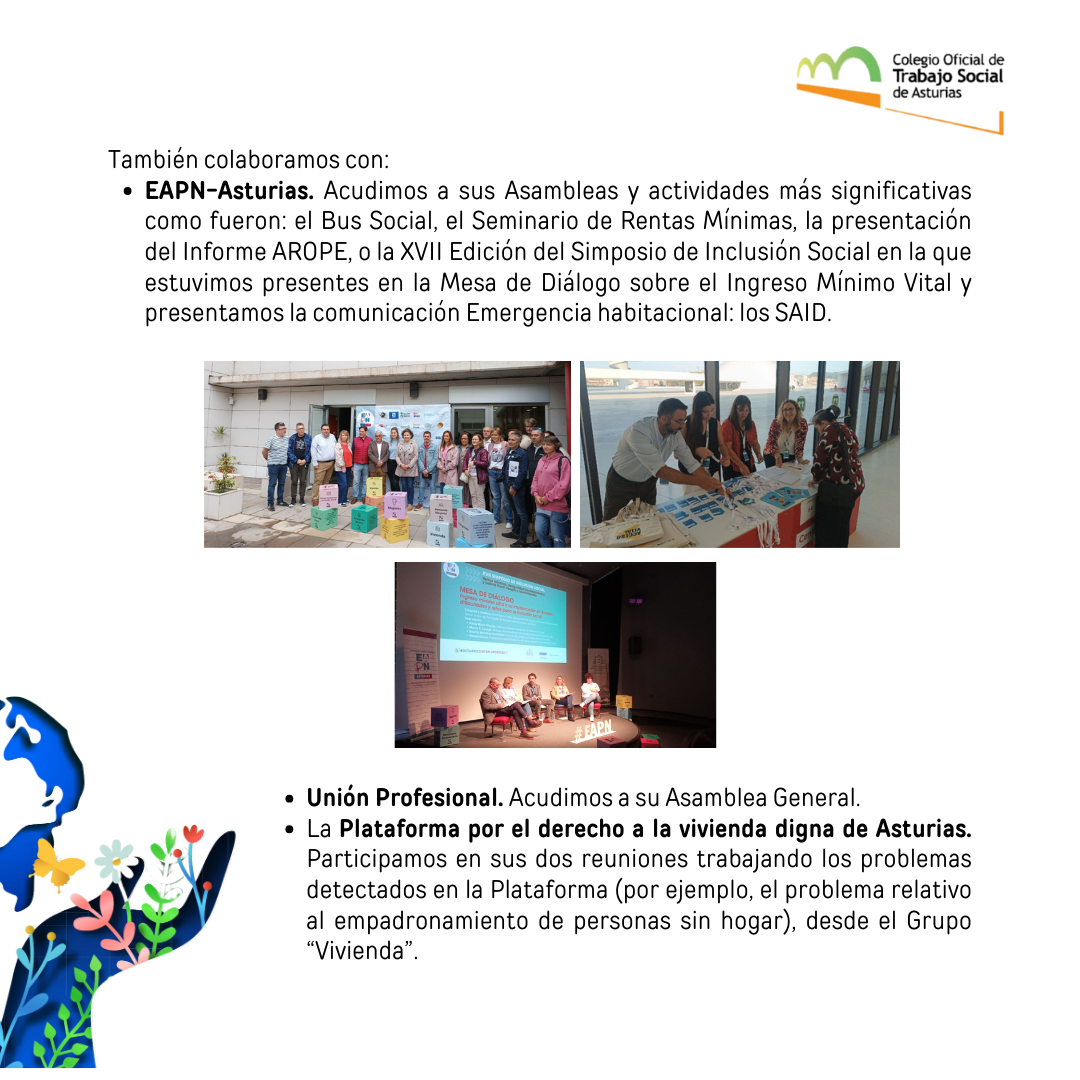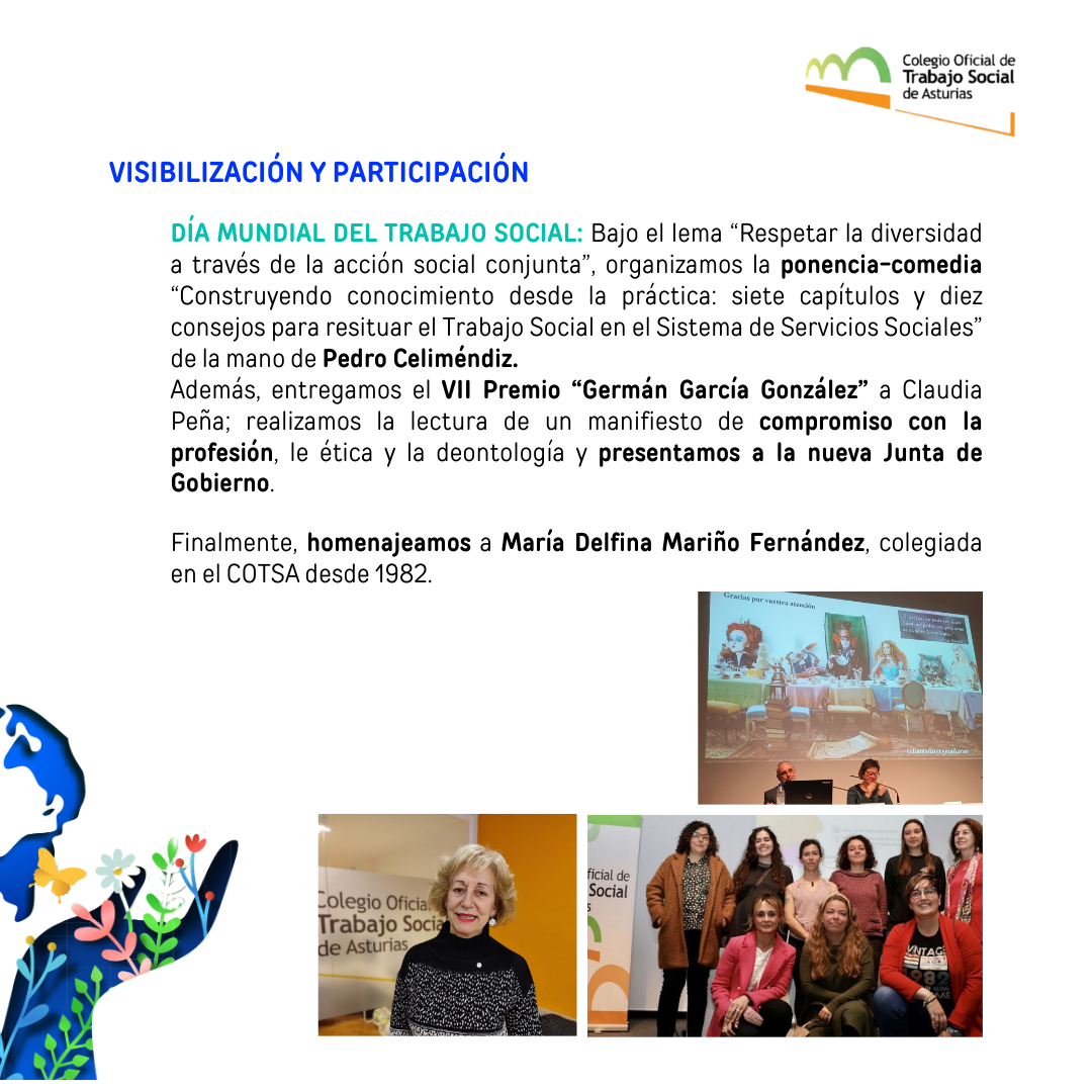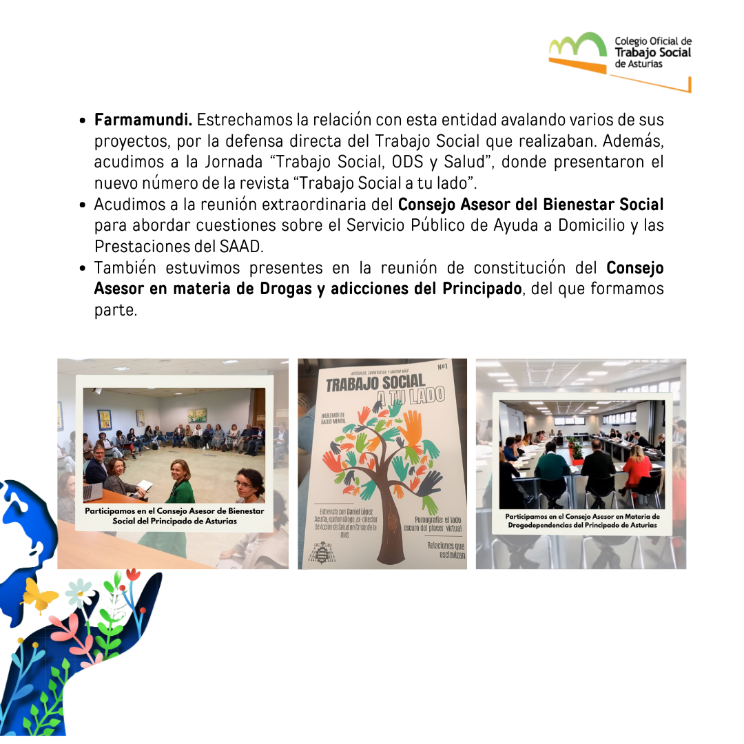 - Y la visibilización de la profesión a través de la participación en diferentes órganos: el Consejo General del Trabajo Social, EAPN-Asturias, Unión Profesional, Farmamundi, la Plataforma por el Derecho a la Vivienda Digna, o los Consejos Asesores tanto de Bienestar Social como en materia de drogas y adicciones del Principado.