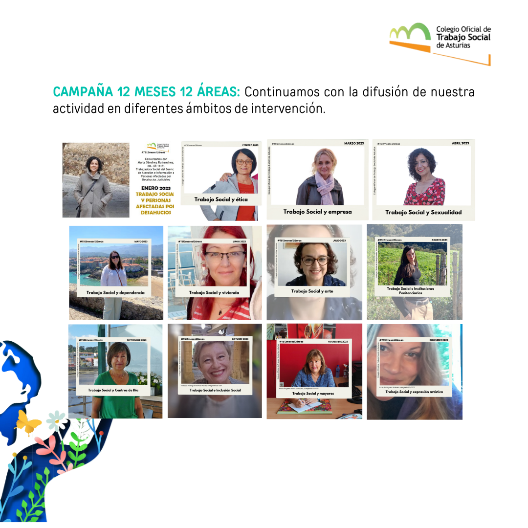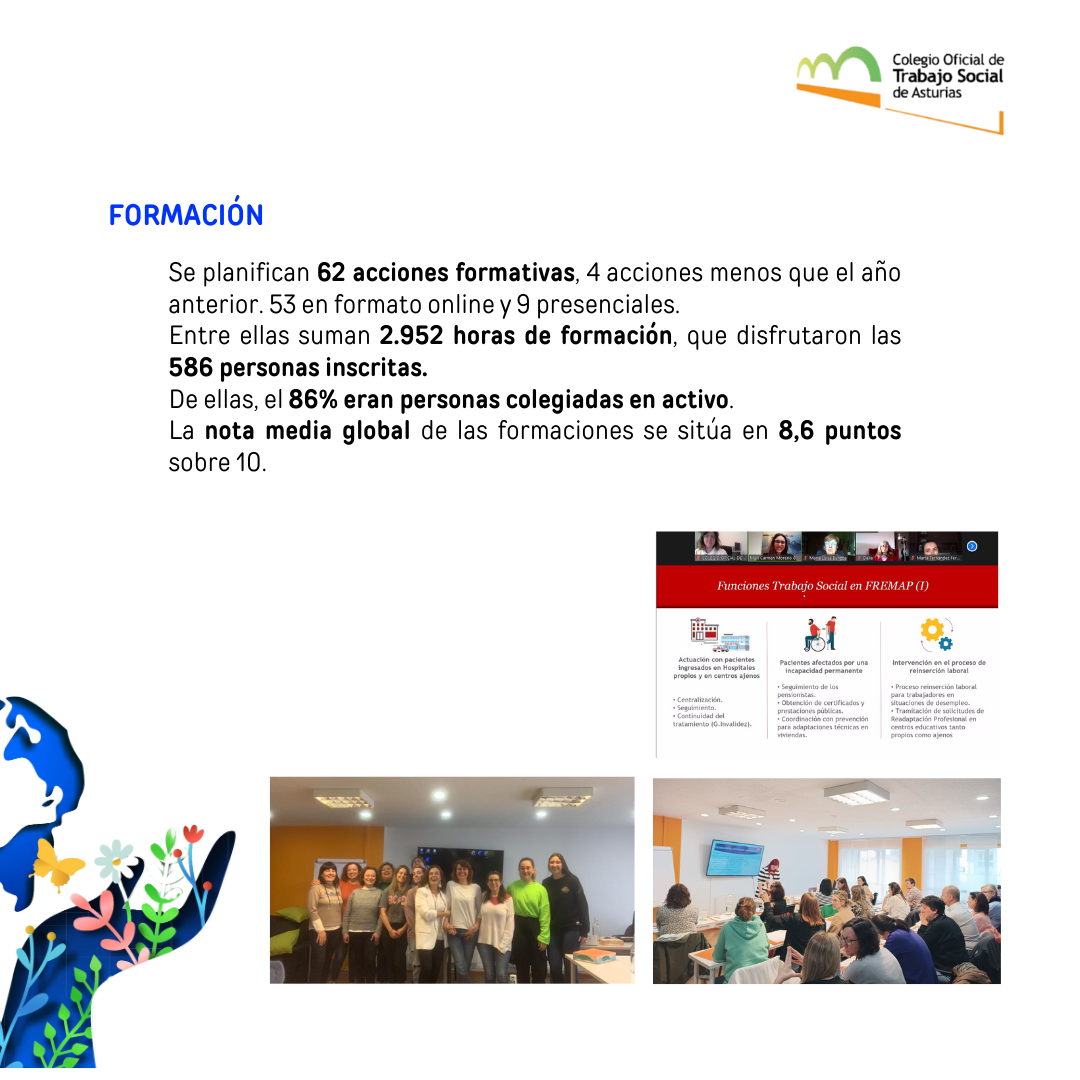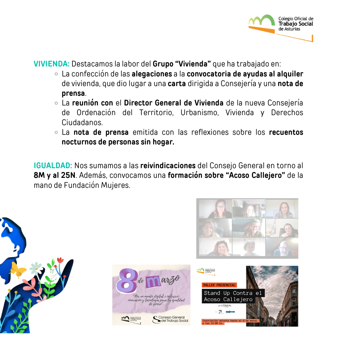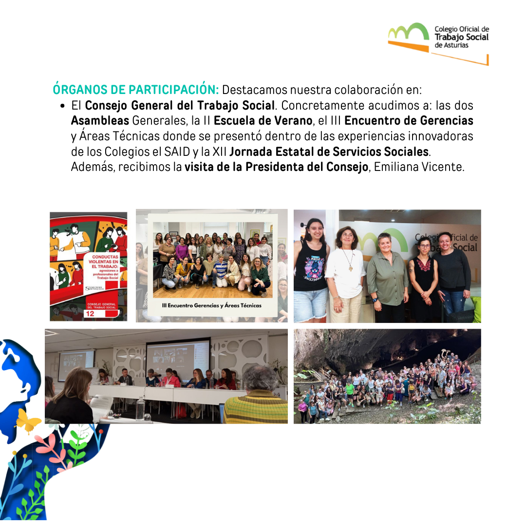 - Y la visibilización de la profesión a través de la participación en diferentes órganos: el Consejo General del Trabajo Social, EAPN-Asturias, Unión Profesional, Farmamundi, la Plataforma por el Derecho a la Vivienda Digna, o los Consejos Asesores tanto de Bienestar Social como en materia de drogas y adicciones del Principado.