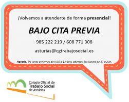 No obstante, antes de acudir, será imprescindible solicitar CITA PREVIA a través del correo asturias@cgtrabajosocial.es o de los teléfonos 985 222 219 / 608 771 308 indicando tu nombre completo, número de colegiada/o y el motivo de su consulta con una antelación mínima de 24 horas. Tu cita será confirmada por el personal del COTSA.