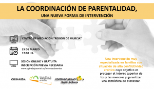 Será impartida por Dª Ana Cobos Pizarro, Abogada, Experta en análisis y gestión de conflictos, mediadora y coordinadora de parentalidad. Sesión modera por la Dra. Urbania Rondón, Abodaga, Psicóloga, mediadora, coordinadora de parentalidad y Directora del Centro de Mediación Región de Murcia.