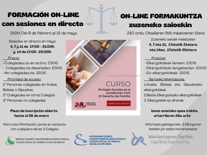 El peritaje social es una rama muy importante y necesaria de nuestra profesión. En este caso, junto con los colegios de Araba y Gipuzkoa, ofrecemos una formación en peritaje de familias y menores de 250h de la mano de Josefa Moreno. La formadora cuenta con una amplia experiencia y conocimiento en la materia, lo que hace de este curso una oportunidad muy rica y única.