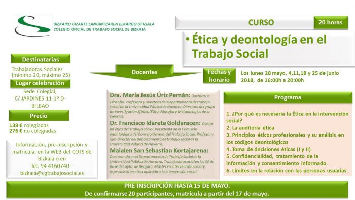 Asi mismo es imprescindible inscribirse al curso en esta página o notificar al colegio la inscripción mediante correo electrónico bizkaia@cgtrabajosocial.es