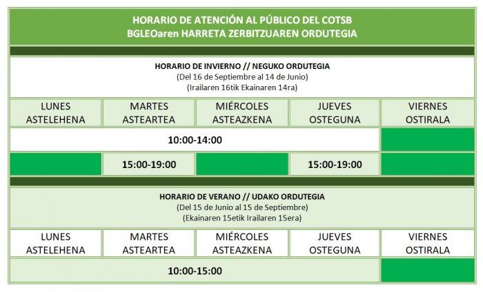 BGLEOaren Ordutegia eta derrigorrezko Aurrez-aurreko HITZORDUA // Horario de atención del COTSB y CITA PREVIA obligatoria