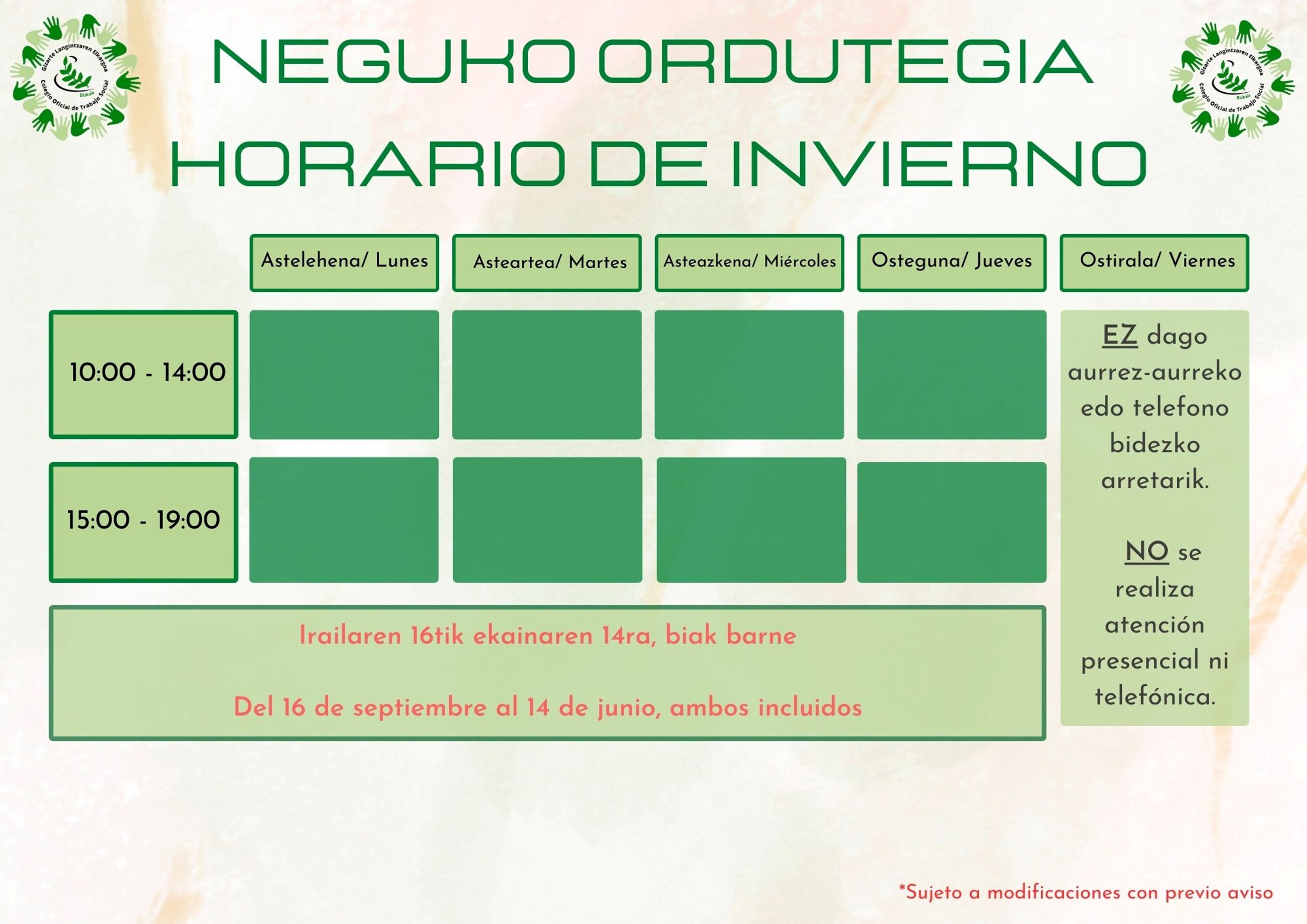 De Lunes a Jueves de 10:00 a 14:00 y de 15:00 a 19:00 Horario de verano del 15 de junio al 15 de septiembre de Lunes a Jueves de 10:00 a 15:00