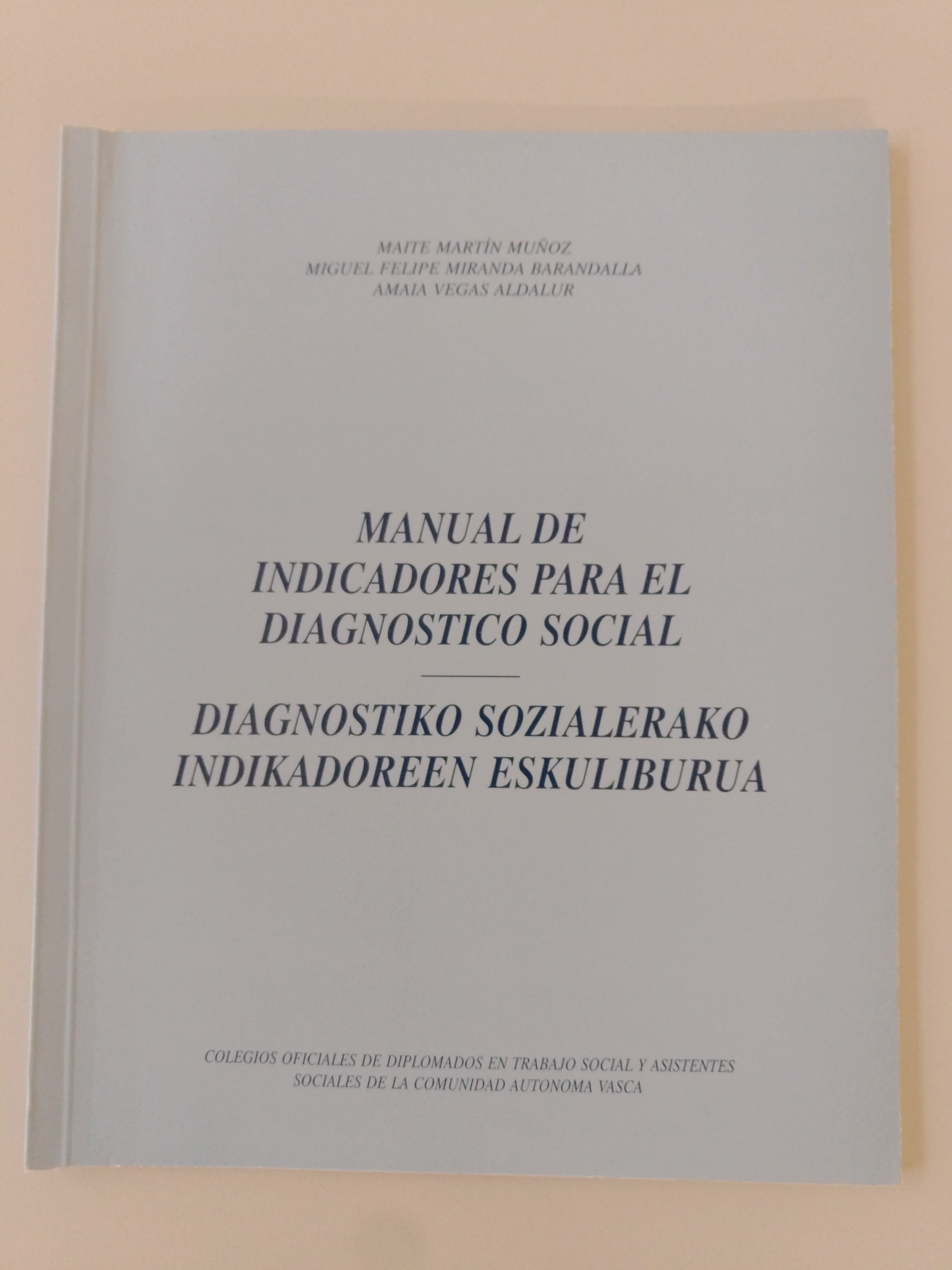 "MANUAL DE INDICADORES PARA EL DIAGNOSTICO SOCIAL-DIAGNOSTIKO SOZIALERAKO INDIKADOREEN ESKULIBURUA" 1996, de MAITE MARTÍN MUÑOZ, MIGUEL FELIPE MIRANDA BARANDALLA Y AMAIA VEGAS ALDALUR, Editorial COLEGIO OFICIALES DE TRABAJO SOCIAL DE LA COMUNIDAD AUTONOMA VASCA
