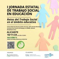 El Consejo General del Trabajo Social en coparticipación con la Universidad de Alicante y Colegio Oficial de Trabajo Social de Alicante, celebran la I Jornada Estatal de Trabajo Social en Educación: retos del Trabajo Social en el ámbito educativo. Un paso más para impulsar la visibilidad y el reconocimiento de los y las trabajadores y trabajadoras sociales de educación como figura de referencia en los centros escolares.