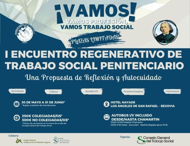 Del 30 de mayo al 1 de junio, se celebrará en el Hotel Náyade de Los Ángeles de San Rafael (Segovia) el I Encuentro Regenerativo para el Trabajo Social Penitenciario: Una Propuesta de Reflexión y Autocuidado. Organizado por el Consejo General del Trabajo Social, en colaboración con el Colegio Oficial de Trabajo Social de Valladolid y Segovia y la Asociación de Trabajo Social Penitenciario