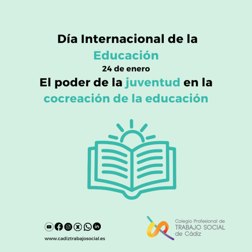 Con motivo del Día Internacional de la Educación 2026, el Colegio Profesional de Trabajo Social de Cádiz se suma al lema propuesto por la UNESCO «El poder de la juventud en la cocreación de la educación», poniendo en valor el papel activo de las personas jóvenes en la construcción de sistemas educativos más justos e inclusivos.