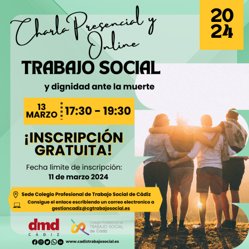 El próximo miércoles 13 de marzo celebramos la Charla “TRABAJO SOCIAL Y DIGNIDAD ANTE LA MUERTE” de manera presencial y daremos la posibilidad de conectarse online a través de un enlace.