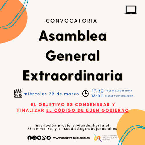 La Junta de gobierno del Colegio Profesional de Trabajo Social de Cádiz, a través de su presidenta y su secretaria, convoca Asamblea General Extraordinaria para el miércoles 29 de marzo de 2023 a las 17:30.