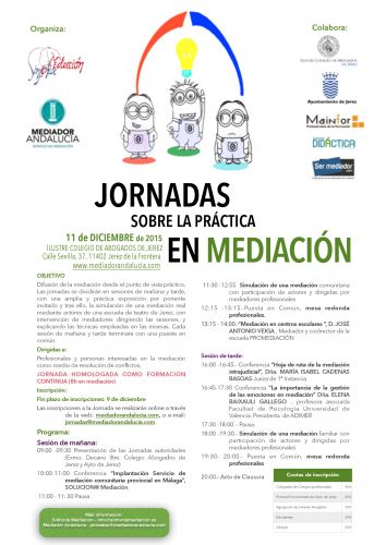 Sinfonía Mediación y Mediador Andalucía con la colaboración del Ilustre Colegio de Abogados de Jerez y Fundación Didáctica organizarán el próximo 11 de diciembre de 2015, las Jornadas sobre la Práctica en Mediación con el objetivo de difundir la mediación desde un punto de vista práctico.