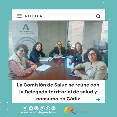 Desde la Comisión de Salud del Colegio Profesional de Trabajo Social de Cádiz, representado por Dña. Ana Rosa Listán Cortés, vicepresidenta del CPTS de Cádiz y responsable de la Comisión; y Dña. Verónica Gutiérrez Mellado, miembro de la Comisión, se ha mantenido una reunión con la Delegada territorial de salud y consumo Dña. Eva Parajes Ruiz. Al encuentro también asistieron Dña. Mª Auxiliadora Fernández Gómez, Jefa del Servicio de salud de la Delegación y Dña. Rocío Fernández Martínez, Secretaria General Provincial de Salud y Consumo en Cádiz.