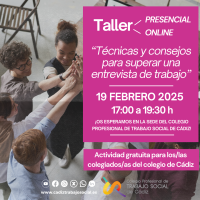 Inscripción: https://cadiztrabajosocial.es/eventos/taller-tecnicas-y-consejos-para-superar-una-entrevista-de-trabajo/2806/view