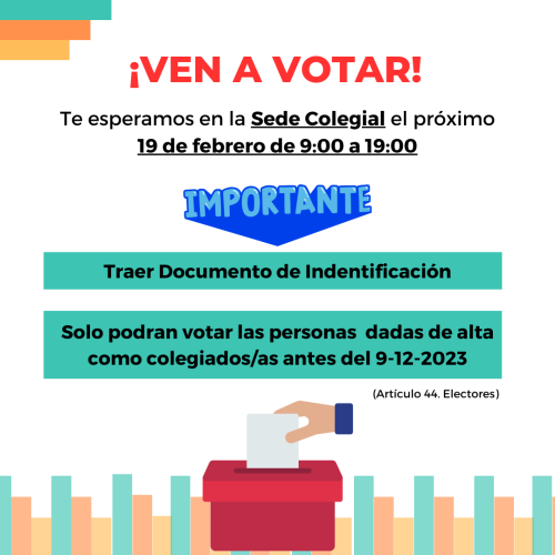Recuerda que podrán votar las personas que se hayan colegiado hasta el 9 de diciembre de 2023. (Estatutos. Art. 44. Electores)