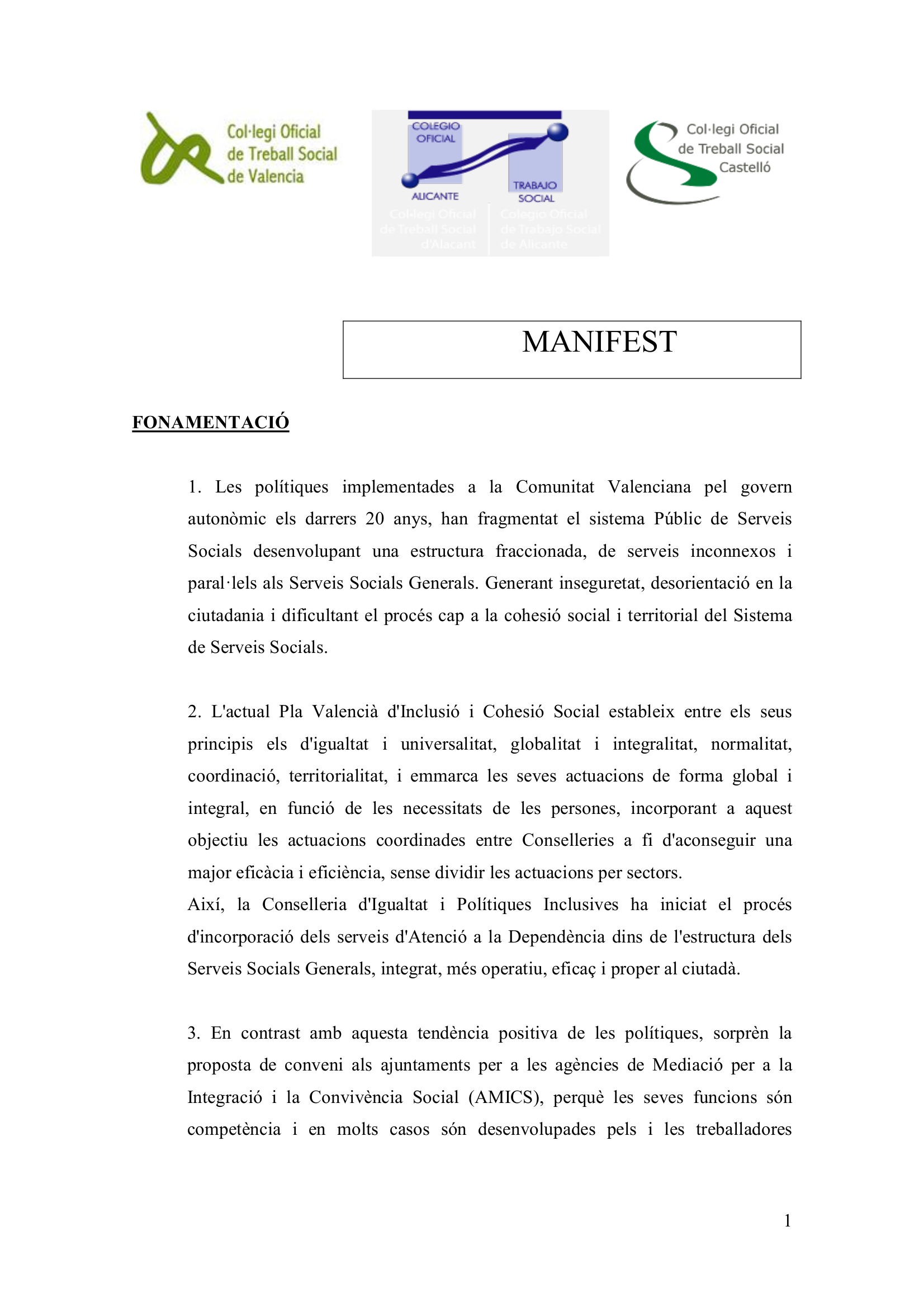 Per a la cloenda de l'acte es va fer la lectura del manifest de la I Jornada Autonòmica de serveis socials de la Comunitat Valenciana per definir el nou model a la Comunitat.