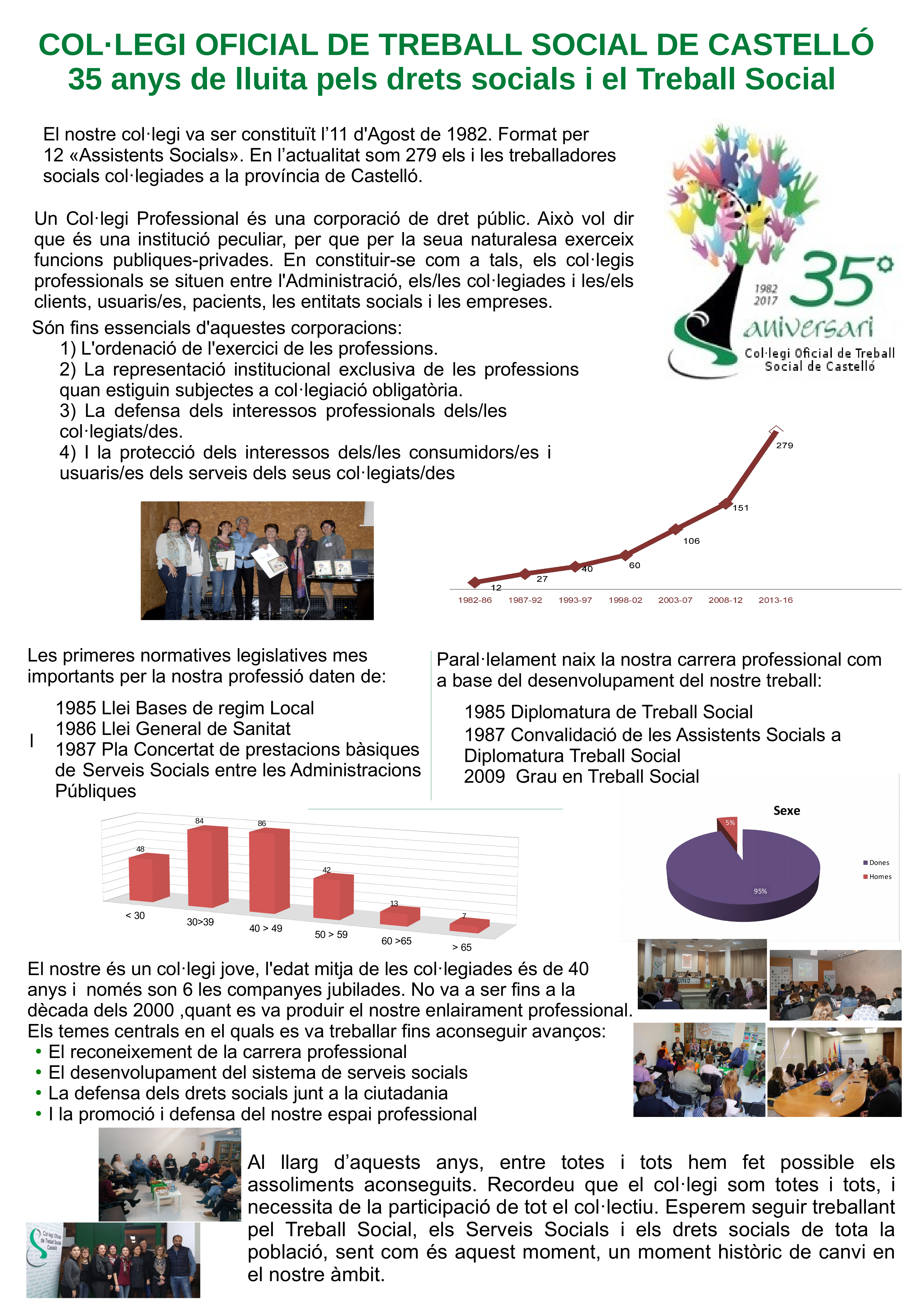 Al llarg de la Jornada celebrarem el 35 aniversari del Col·legi destacant la seua trajectòria durant aquests anys, així com la relació que existeix amb el desenvolupament de la nostra professió i les polítiques socials. Pòster del 35 aniversari.