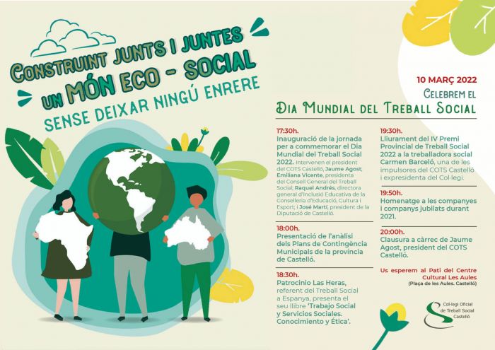 La cita del pròxim dijous serà l’avantsala de la celebració institucional del Dia Mundial del Treball Social, que tindrà lloc el 15 de març i que enguany aterra amb el lema Construint un nou món eco-social: sense deixar a ningú enrere, en línia amb el títol de la Cimera Mundial 2022 (del 29 de juny al 2 de juliol). En aquesta ocasió l’esdeveniment internacional estarà liderat per la Federació Internacional de Treballadors/as Socials i l’Institut d’Investigació de les Nacions Unides per al Desenvolupament Social (UNRISD).