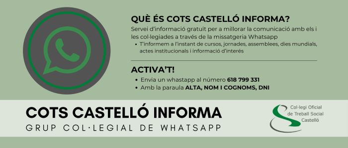 El Col·legi Oficial de Treball Social de Castelló ofereix un nou servei d’informació totalment gratuït per a millorar la comunicació amb les i els col·legiats a través de la missatgeria Whatsapp. L’objectiu és mantindre’ls informats pràcticament en temps real de les novetats que es produïsquen en l’àmbit del Treball Social i els Serveis Socials així com de les activitats que duu a terme el Col·legi.